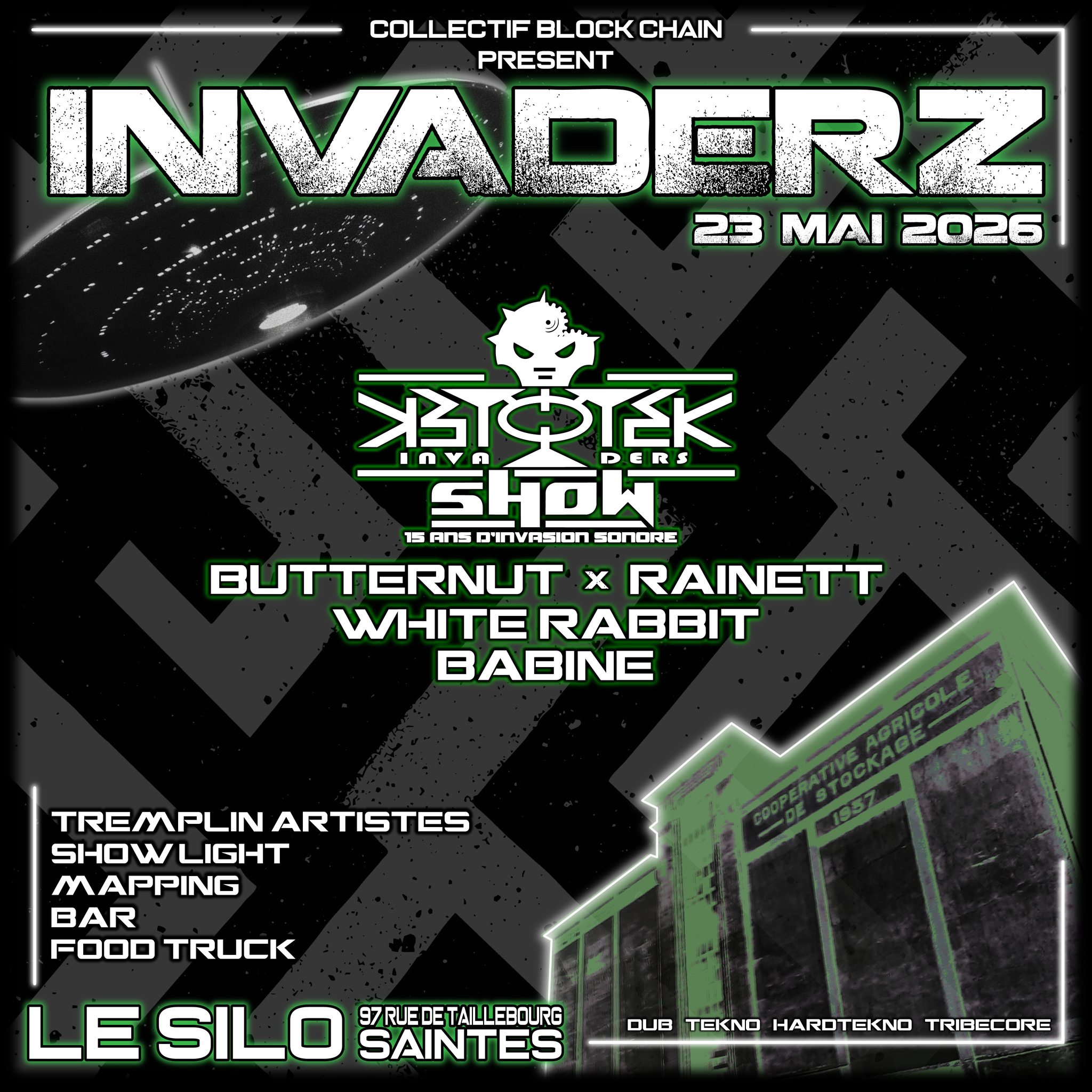 Block Chain, Le Silo et Biotek — trois collectifs, une alliance brute — s’unissent pour faire vibrer Saintes comme jamais. Rendez-vous le 23 mai à partir de 19h pour une soirée sans compromis.